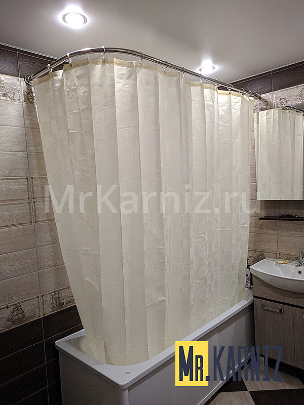 Компания Mr.Karniz производит штанги для ванных комнат, которым можно придать любую форму. Материалом таких изделий является особый вид алюминия. Часто гибкие карнизы для ванной используются в стандартных, круглых, полукруглых комнатах. Монтируются к стенам или потолку (если конструкция последнего это позволяет).